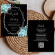 This elegant modern wedding invitation features a silver geometric frame decorated with aqua and silver flowers on a black background. The customizable text combines silver gray whimsical handwriting, copperplate and italic fonts. Add additional details on the back, along with a QR code to help your guests visit your wedding website.