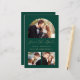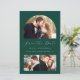 This simple, minimalist Save the Date card features a photo collage arch, with a horizontal photo at the top and two square photos below. Between the top and bottom photos, the words "Save the Date" appear in elegant gold-coloured handwriting script, followed by the couple's names, wedding date and city in sans serif font on an emerald green background. Add a more detailed message with additional information on the back, along with a QR code to help your guests visit your wedding website.