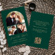 This simple, minimalist Save the Date card features a photo collage arch, with a horizontal photo at the top and two square photos below. The words "Save the Date" appear in elegant gold-coloured handwriting script, followed by the couple's names, wedding date and city in sans serif font on an emerald green background. Add a more detailed message with additional information on the back, along with a QR code to help your guests visit your wedding website..