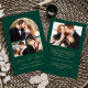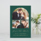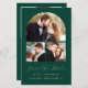 This simple, minimalist Save the Date card features a photo collage arch, with a horizontal photo at the top and two square photos below. The words "Save the Date" appear in elegant gold-coloured handwriting script, followed by the couple's names, wedding date and city in sans serif font on an emerald green background. Add a fourth, horizontal photo to the back, along with a more detailed message with additional information.