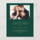 This simple, minimalist Save the Date card features a photo collage arch, with a horizontal photo at the top and two square photos below. The words "Save the Date" run vertically up the left margin in elegant gold-coloured handwriting script. The couple's names, wedding date and city appear below the photo collage in sans serif font on an emerald green background. Add a fourth, horizontal photo and amore detailed message with additional information on the back.
