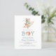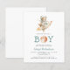 This cute baby shower invitation features a watercolor teddy bear astronaut riding a rocket ship above the words "Houston we have a BOY," with a watercolor planet replacing the "O" in "BOY." Personalize the text with the name of the mom-to-be in blue-green and the details in charcoal gray sans serif font.