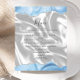 This elegant modern wedding menu features a top and bottom borders of pastel baby blue watercolor agate trimmed with silver faux glitter. The customisable text combines charcoal grey whimsical handwriting and sans serif fonts on a background image of white silk or satin.