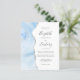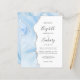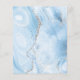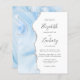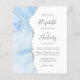 The left-hand edge of this elegant modern wedding invitation features a pastel baby blue watercolor agate border trimmed with faux silver glitter. The customisable text combines handwriting, copperplate and italic fonts in charcoal grey on a white background. The reverse side features a matching baby blue and gold agate design.