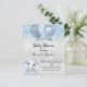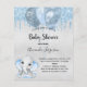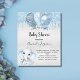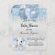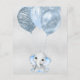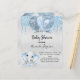 For a baby shower, celebrating a baby boy. A faux silver metallic looking background. Decorated with blue faux glitter drips, paint dripping look, balloons and a cute little baby elephant boy. Personalise and add the name of the mum to-be's name and party details. The name and the text: Baby Shower are written with a hand lettered style script