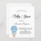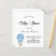 For a baby shower, celebrating a baby girl. A white background, and a cute little baby elephant boy in a blue hot air balloon. Personalise and add the name of the mum to-be's name and party details. The name and the text: Baby Shower are written with a hand lettered style script