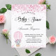 For a baby shower, celebrating a baby girl. A white background. Decorated with blush pink faux glitter dust, and a cute little baby elephant girl in a hot air balloon. Personalise and add the name of the mum to-be's name and party details. The name and the text: Baby Shower are written with a hand lettered style script