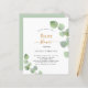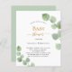 Welcome to an elegant Baby Shower. A chic white background. Decorated with green watercolored eucalyptus leaves, sprigs. Personalise and add the name of the mum to be and paraty details. Black and golden letters.