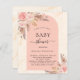 For a modern boho baby shower. An arch frame and rose gold marble print as background. Decorated with rose gold and pink florals, roses and pampas grass. Personalise and add a name and details.