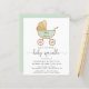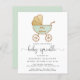 This cute budget-friendly and gender-neutral baby sprinkle invitation features a pastel mint green and gold watercolor of a retro baby carriage. You can personalise the text on the carriage (e.g., "It's a Girl!) or leave blank. "baby shower" is written in a stylish script with swashes.