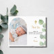 A modern and elegant baptism thank you card. A chic white background decorated with eucalyptus greenery. Personalise and add your photo of the child, thank you note and name. Photo arch frame.