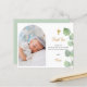 A modern and elegant baptism thank you card. A chic white background decorated with eucalyptus greenery. Personalise and add your photo of the child, thank you note and name. Gender neutral. Photo arch frame.
