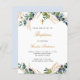 A white background decorated with eucalyptus greenery and golden leaves. Personalise and the child's name and ceremony details. Black and golden coloured letters.