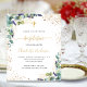 A white background decorated with eucalyptus greenery and golden leaves and faux gold glitter dust. Personalise and the childs name and ceremony details. Black and golden coloured letters.