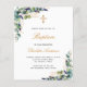A white background decorated with eucalyptus greenery and golden leaves and a golden cross. Personalise and the childs name and ceremony details. Black and golden coloured letters.