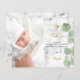 A modern and elegant baptism thank you card. Marble stone print as background decorated with eucalyptus greenery. Personalise and add your photo of the child, thank you note and name. Gender neutral.