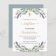 A white background decorated with lavender flowers and eucalyptus greenery. Personalise and a name and ceremony details. Black and golden coloured letters.