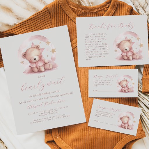 This cute baby shower invitation features a sweet watercolor bear in a pink dress surrounded by gold stars, above the words "we can bearly wait" in pink handwriting script. Personalise the text with the name of the mum-to-be in pink script and the details in sans serif font on a beige background.