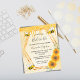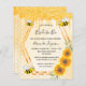 Elegant, fun, rustic summer bridal shower invitation. A yellow background with a honeycomb pattern. With a faux gold geometric frame and faux gold glitter drips. Decorated with yellow and orange sunflowers and happy bumble bees. With the text: Bride to Bee and the name of the bride on front written with a modern hand lettered style script. Black letters.