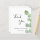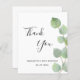 A thank you card for a 50th (or any age) birthday. A chic white background decorated with eucalyptus greenery. On front large black coloured hand lettered script and the text: Thank You, your text, title and a date.