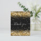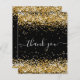 A feminine and elegant birthday thank you card. A black background colour. With faux gold glitter dust. On front, large hand lettered script and the text: Thank You.