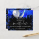 A black background decorated with royal blue drips, confetti, and balloons. Personalise and add a date and name/age. The text: Save the Date is written with a large trendy hand lettered style script.