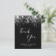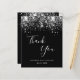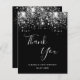 A thank you card for a 50th (or any age) birthday. A black background color, decorated with faux silver glitter. On front large white colored hand lettered script and the text: Thank You, your text, title and a date.