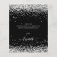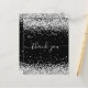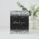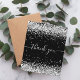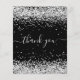 A feminine and elegant birthday thank you card. A black background colour. With faux silver glitter dust. On front, large hand lettered script and the text: Thank You.