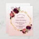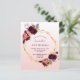 On front: An invitation for a 40th (or any age) birthday party. An elegant and trendy rose gold, white gradient background with a faux gold geometric frame. Decorated with dark purple and burgundy flowers, roses and boho style feathers. Templates for a name and party details. The name is written with a hand lettered style script, purple coloured letters.