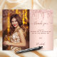 On front: Add a vertical size photo. An elegant rose gold, blush gradient background colour, decorated with faux glitter drips, paint dripping look. Personalise and add a name and your thank you note.