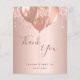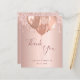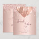A thank you card for a Sweet 16, 16th birthday. A rose gold faux metallic looking background color. With faux glitter drips, paint dripping look and balloons. On front large dark rose gold colored hand lettered script and the text: Thank You, your text, title and a date.