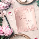 A thank you card for a 50th (or any age) birthday. A rose gold, pink faux metallic looking background colour. With sparkling faux glitter drips. On front large dark rose gold coloured hand lettered script and the text: Thank You.