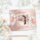 A simple and elegant sympathy thank you card with photo. A rose gold faux metallic looking background, a white frame, faux silver glitter dust, white and rose gold roses, florals. Personalise and add your thank you note. Black text.
