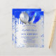 A faux silver looking background. Decorated with royal blue faux glitter drips paint dripping look, sparkles and balloons. Personalise and add a name and party details. The name is written with a hand lettered style script.