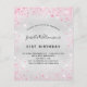 For an elegant 21st (or any age) birthday. A faux silver metallic looking background. Decorated with pink faux glitter dust. Personalise and add a name, age and party details. The name is written with a hand lettered style script