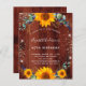 For a 40th (or any age) birthday party. Rustic brown wood as background decorated with watercolored sunflowers, eucalyptus greenery and golden leaves. Faux gold glitter dust. Personalise and add your names and wedding details.