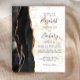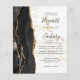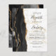 The left-hand edge of this elegant modern wedding invitation features a black watercolor agate border trimmed with faux gold glitter. The customizable text combines black handwriting script with black copperplate and italic fonts on a white and gold marble background. The reverse side features a matching black and gold agate design.