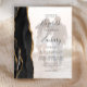 This elegant wedding design features a vertical photo of the couple softened with a white screen to highlight the text overlay. The left-hand edge features a black watercolor agate border trimmed with faux gold glitter. The customizable black text combines handwriting, copperplate and italic fonts. Easily replace the sample image on the back with a second vertical photo, and add a brief message with additional information such as your wedding website URL.