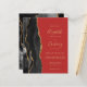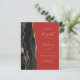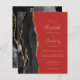 The left-hand edge of this elegant modern wedding invitation features a black watercolor agate border trimmed with faux gold glitter. The customisable text combines gold-coloured handwriting, copperplate and italic fonts on a red background. The reverse side features a matching black and gold agate design.