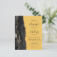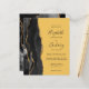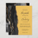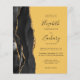 The left-hand edge of this elegant modern wedding invitation features a black watercolor agate border trimmed with faux gold glitter. The customisable text combines off-black handwriting, copperplate and italic fonts on a yellow background. The reverse side features a matching black and gold agate design.