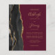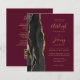 Save the cost of printing and mailing separate RSVP cards with this elegant modern all-in-one budget wedding invitation. The left-hand edge features a black watercolor agate border trimmed with gold faux glitter. The customisable text combines gold-coloured handwriting, copperplate and italic fonts on a burgundy background. The reverse side provides space for wedding details on a solid burgundy background, along with a QR code guests can scan to visit your website and RSVP.
