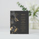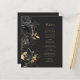This elegant modern wedding menu features a border of black flowers and gold faux foil leaves. Customise the gold-coloured italic text on a dark slate black background. The back of the menu is solid slate black,
