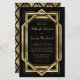 This elegant vintage-inspired wedding invitation features gold-coloured text on a black background, framed by a geometric vintage art deco design. A coordinating gold and black art deco fan pattern decorates the back of the card.