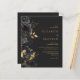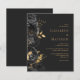 This dark, moody floral wedding invitation features a border of black flowers set off with gold faux foil foliage. The names of the couple appear in classic gold-coloured serif font, with the remaining text in italics, on an off-black background.