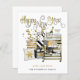 A budget price SMALLER 4.5” x 5.6” flat card for your new year greetings on a shiny SEMI GLOSS 110 lb card stock (similar to the thickness of a postcard) PLEASE NOTE: The envelope supplied with this card is slightly larger than the card itself. Black Gold Glitter Script Happy New Year. Sparkly greetings for your family and friends with this glitz and glam design in elegant black and gold with Happy New Year in a set decorative faux glitter script and a picture filled with celebratory items, champagne, gifts and partyware. Easily personalise your greeting and names at the bottom.