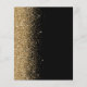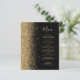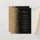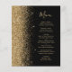 The left-hand edge of this elegant modern wedding menu features a gold faux glitter border. The customisable text combines gold-coloured whimsical handwriting script and copperplate fonts on a black background. The reverse side features a matching black and gold glitter design.