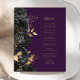 This elegant modern wedding menu features a border of black flowers and gold faux foil leaves. Customise the gold-coloured italic text on a dark purple background. The back of the menu is solid purple,