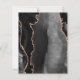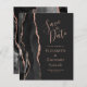The left-hand edge of this elegant modern wedding save the date card features a black watercolor agate border trimmed with faux rose gold glitter. The customizable text combines rose handwriting, copperplate and italic fonts on a dark charcoal gray background. The reverse side features a matching black and rose gold agate design.