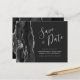 This elegant modern save the date card features a black watercolor agate border trimmed with faux silver glitter. The customisable text combines handwriting script, copperplate and italic fonts in silver grey on an off-black background. The back features a matching black and silver agate design.