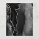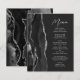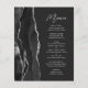 The left-hand edge of this elegant modern wedding menu features a black watercolor agate design trimmed with faux silver glitter. The customisable text combines silver grey handwriting script and sans serif fonts on a dark slate black background. The black and silver agate design is repeated on the reverse side.